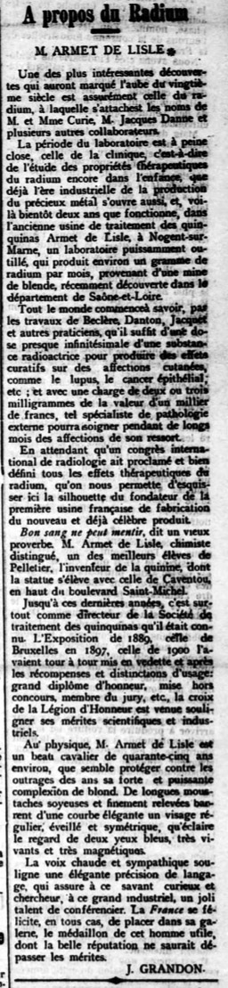A la mort de son père, Emile Armet de Lisle hérite en 1878 d'une fabrique de quinquinas. Installée à Nogent-sur-Marne, cette usine est perçue comme la plus importante dans sa spécialité, chaque année, elle traite 500 000 kilos de quinquinna. Quand il prend la direction de la maison, Emile Armet de Lisle se contente d'abord de poursuivre l'entreprise de son père. Mais très vite, il s'intéresse aux travaux des Curie. Dès le départ, des relations serrées se nouent entre lui et le laboratoire des Curie. En 1904, il se lance grâce à eux dans la production industrielle du radium (voir article à droite dans La France, le 28 décembre 1905). Pour Armet de Lisle, le laboratoire est un réservoir naturel de techniciens et conseillers. De surcroît, son entreprise peut associer son nom à celui du couple de savants les plus célèbres de France. Sa publicité ne se fait pas faute de le rappeler: l'activité de ses sels de radium « est mesurée avec les appareils de M. Curie par son préparateur Mr Danne ». En retour, les Curie obtiennent un soutien logistique essentiel pour leurs travaux.