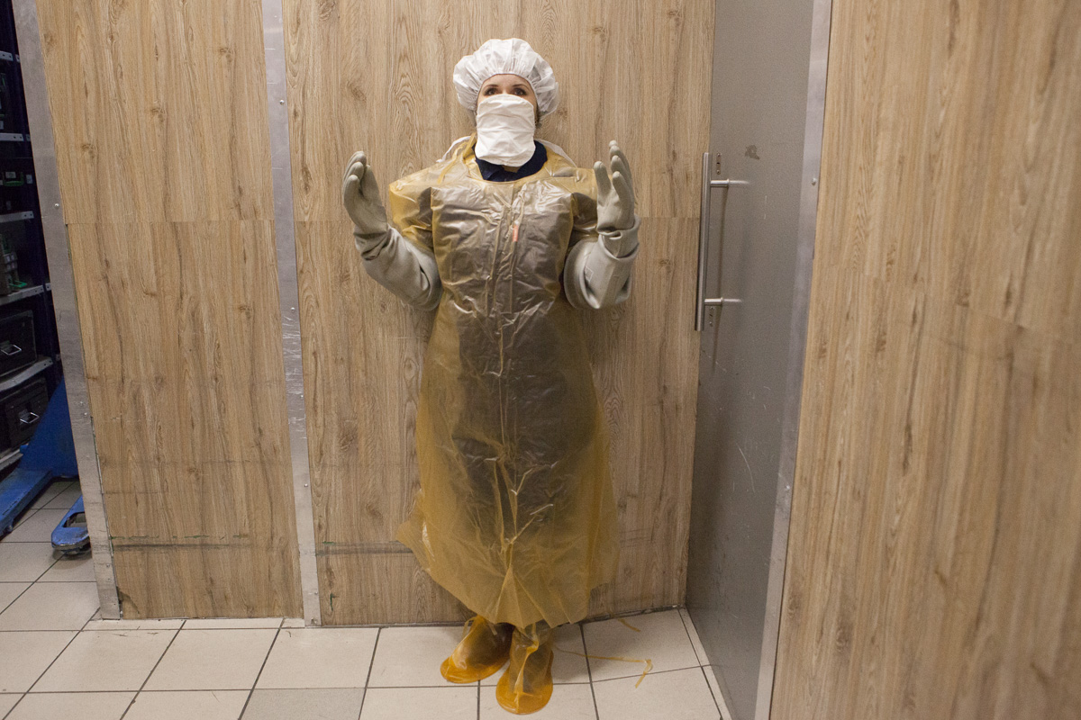 Ainsi, le dosimètre-radiomètre a montré que le rayonnement des billets dépassait les valeurs admissibles. Le caissier, ayant suivi une formation appropriée, porte une combinaison de protection. Il ne s'agit en aucun cas d'une combinaison spatiale en plomb, mais simplement d'une robe ou d'un tablier, de gants, d'une casquette et d'un masque. Ce kit offre une bonne protection contre les particules bêta et est totalement inutile contre les rayonnements gamma, mais sa tâche principale est d'empêcher les radionucléides de pénétrer dans la peau et les voies respiratoires de l'employé.