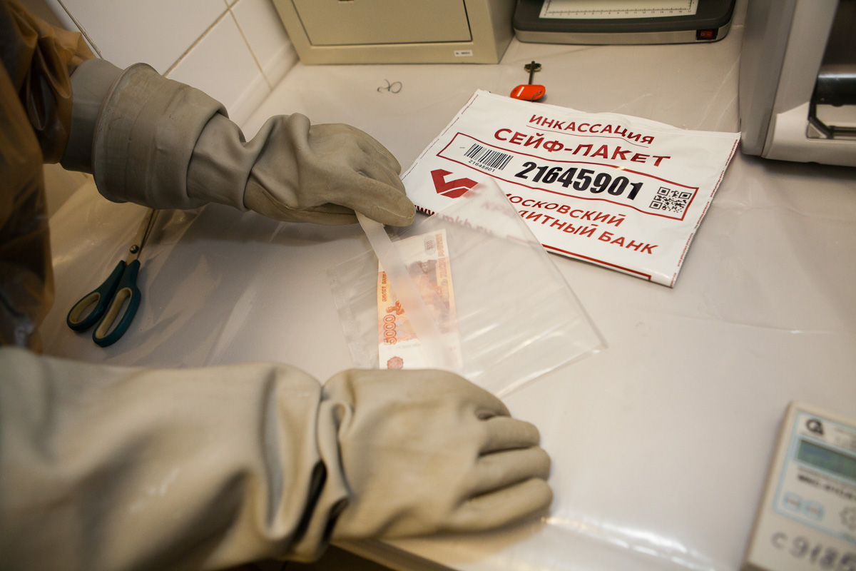 À l'aide de pinces spéciales d'un demi-mètre à un mètre de long, des paquets de réserves de liquidités sont chargés dans un chariot métallique et transportés dans une salle spéciale, qui devrait se trouver dans chaque agence bancaire qui manipule des espèces. Conformément au 131-I, il doit s'agir d'un local chauffé comprenant une table, de l'eau courante, une hotte aspirante, une trousse de secours, un extincteur, un radiomètre-dosimètre, un appareil d'authentification des billets, un coffre-fort et un téléphone. Ce dernier est nécessaire à la communication avec le monde extérieur - la pièce est verrouillée jusqu'à la fin des manipulations avec la protection de la télécommande.