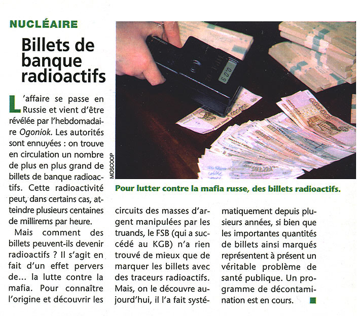 Ce danger n'est en aucun cas illusoire. Comme l'a informé Banki le service de presse de la Banque centrale, « au cours de l'été 2010, 421 billets ont été découverts dans des établissements de crédit à Moscou et en 2012, 12 billets présentant un degré élevé de contamination radioactive. Il y a eu des cas où des billets individuels ont été identifiés comme étant contaminés à des niveaux jusqu'à 26 000 fois supérieurs au niveau naturel.
