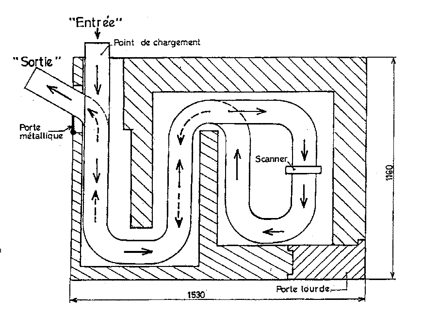 Le plan situe la salle d'irradiation, la chicane parcourue par le convoyeur et l'emplacement des deux portes et du "scanner".