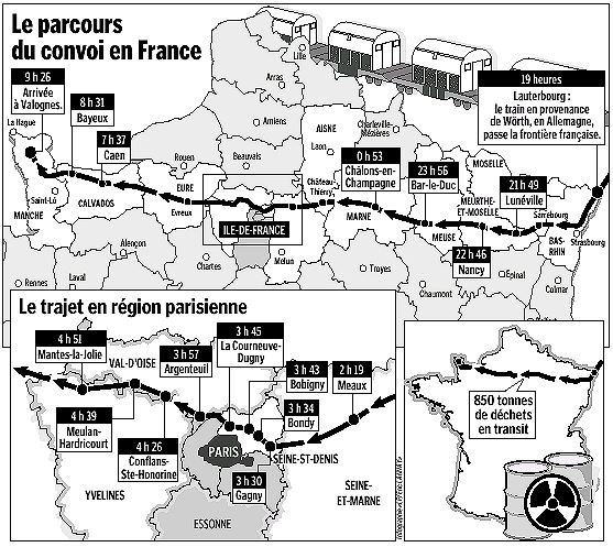 Le passage du train transportant des déchets nucléaires a été régulièrement bloqué depuis son départ de Woerth (Allemagne) mardi après-midi, notamment avant son passage à la frontière française, à Hagenbach (Allemagne), puis à Bondy (Seine-Saint-Denis), Conflans Fin d'Oise (Yvelines), Evreux (Eure) et Caen.
