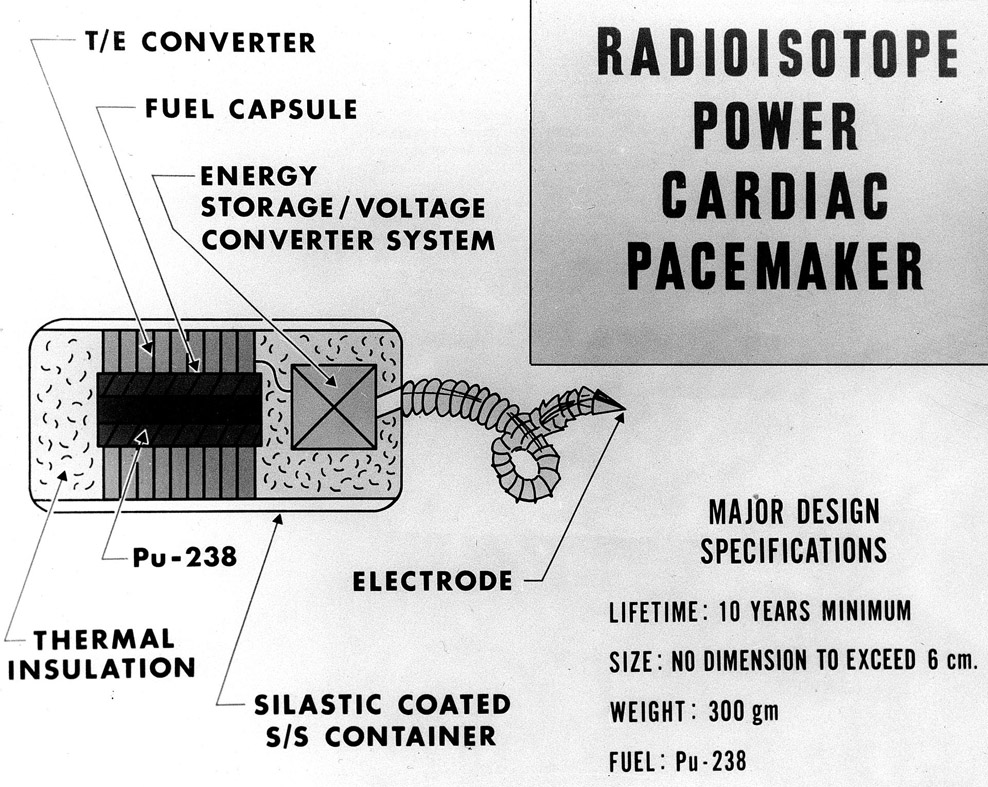 [...] Notre Commissariat à l'énergie atomique (CEA) eut à un moment un éclair de génie: doter le stimulateur cardiaque d'un générateur au plutonium 238. Un puissant émetteur de particules alpha, d'un très faible volume, devait garantir une durée de vie impressionnante à l'appareil. Les concepteurs du système ont d'ailleurs remarquablement résolu les problèmes de refroidissement, de confinement de la source, de transformation de l'énergie thermique en électricité. Et dans le minuscule espace alloué par un pacemaker. Ils ont simplement voulu méconnaitre les risques fantastiques que constituent ces charges ambulantes de plutonium, matière toxique dont l'absorption par l'être humain est très dangereuse. Des terroristes pouvaient facilement convoiter cette réserve de "poison" implanté chez un homme pour la déverser dans un réservoir d'eau potable et tuer ainsi des dizaines de milliers de personnes par contamination orale. Au demeurant, la réglementation internationale concernant le transport des matières fissiles faisait des parias de ces "empilés" au plutonium. Il y eut cependant plus de mille patients équipés du Gipsie (1) atomique, à un coût incomparablement supérieur à celui d'un appareil ordinaire.