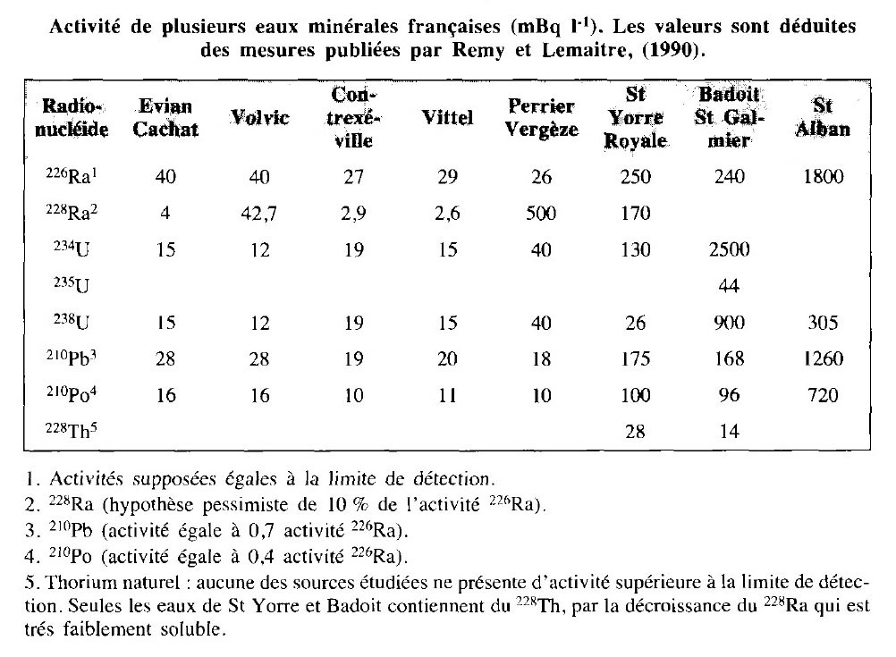 Mme Curie termine un Traité de radioactivité, écrit de ses mains profondément brûlées (par la radioactivité) en 1934, l'année de sa mort (due à "une anémie pernicieuse aplasique à marche fébrile" selon le communiqué officiel) résultant de l'accumulation de l'effet des radiations. Elle cite dans cet ouvrage comme "thérapeutiques médicales" l'ingestion sous forme de boisson d'eau radioactive naturelle ou artificielle contenant du radon; les injections dans les veines, muscles ou articulations de sérum physiologique contenant un radioélément en suspension ou dissous, l'inhalation d'air contenant du radon (l'empereur François-Joseph faisait dans ce but une cure annuelle à Badgastein), ou enfin les bains d'eaux radioactives naturelles ou artificielles ainsi que ceux de boue à base de radium. Mme Curie reconnaissait toutefois dans ce passage consacré à "la curiethérapie par voie interne ou par bains" que "les bases scientifiques sont ici encore peu développées et le caractère empirique prédomine".