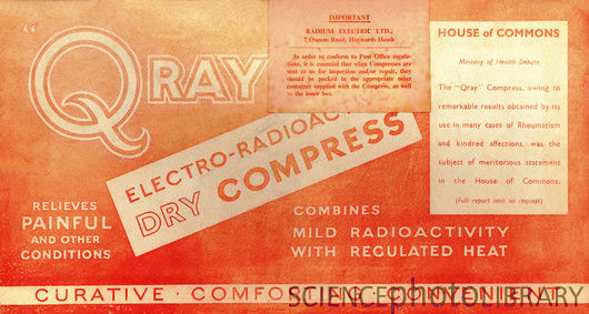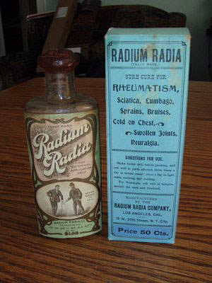 Dans les années 1930, des préparations à base de Radium sont vantées pour guérir de presque toutes les maladies imaginables de l'arthrite au cancer, de l'hypertension artérielle à la cécité. Quelle que soit sa puissance médicale, le radium avait certainement le pouvoir d'inspirer les charlatans.