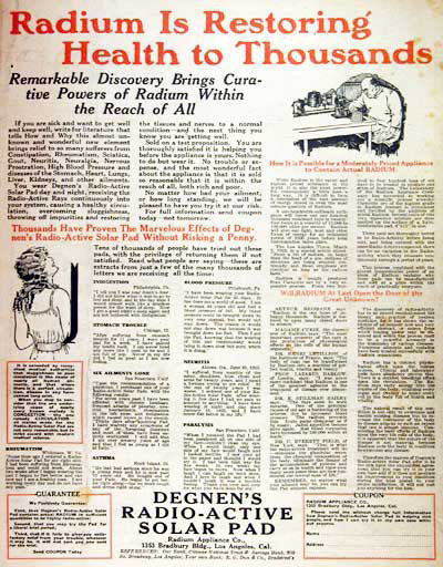 1929 Radium Solar Pad original vintage advertisement. This device consisted of a radioactive pad worn on the back. Touted to relieve numerous ailments such as indigestion, asthma, neuritis, paralysis, rheumatism and more. Includes quotes from 5 medical experts including Madame Marie Curie: