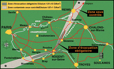 Nous avons pris pour critères la loi adoptée par le parlement ukrainien en 1991, 5 ans après la catastrophe de Tchernobyl : décision d'évacuation obligatoire des habitants vivant sur des zones contaminées à plus de 15 curies au km2 en césium 137 (15 Ci/km2 en Cs 137). Nous avons redessiné le lobe correspondant à une contamination surfacique supérieure à 15 Ci/km2 : à l'intérieur de ce lobe foncé tous les habitants devraient être évacués, c'est à dire jusqu'à une cinquantaine de kilomètres de Nogent...