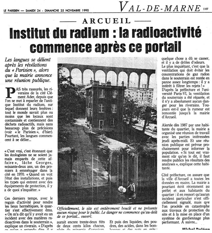 C'est dans les années 1930 que Marie Curie installe ses laboratoires en plein centre-ville d'Arcueil. Dans ce laboratoire, elle va extraire des radioéléments naturels à partir de minerais d'origines diverses qui sont régulièrement importés par camions. Par la suite, l'Institut de physique nucléaire de la faculté des sciences de Paris et Orsay y effectue des recherches avant que la Fondation Curie-Institut du radium ne prenne sa place pour ses propres études radiochimiques. En 1978, les locaux sont abandonnés et mis sous surveillance. Dans les années 1980, le préfet du Val-de-Marne demande au propriétaire, qui est l'université Paris-VI, d'assurer la sécurité des lieux par une clôture interdisant toute intrusion et par un murage du bâtiment le plus contaminé. En 1991, puis en 2000, les 5400 m2 de terrain et les 500 m2 de bâtiments font l'objet d'une décontamination. Deux tonnes de produits chimiques sont enlevées mais des flacons et des fioles de produits chimiques et radioactifs continuent à dormir dans un souterrain inaccessible. Mais la décontamination coûte cher et, ni le ministère de l'Education nationale, ni celui de l'Environnement ne débloquent les crédits nécessaires à l'opération. L'année dernière, une réunion publique avait permis aux riverains d'apprendre que la dépollution se poursuivait et devrait être achevée en 2012.