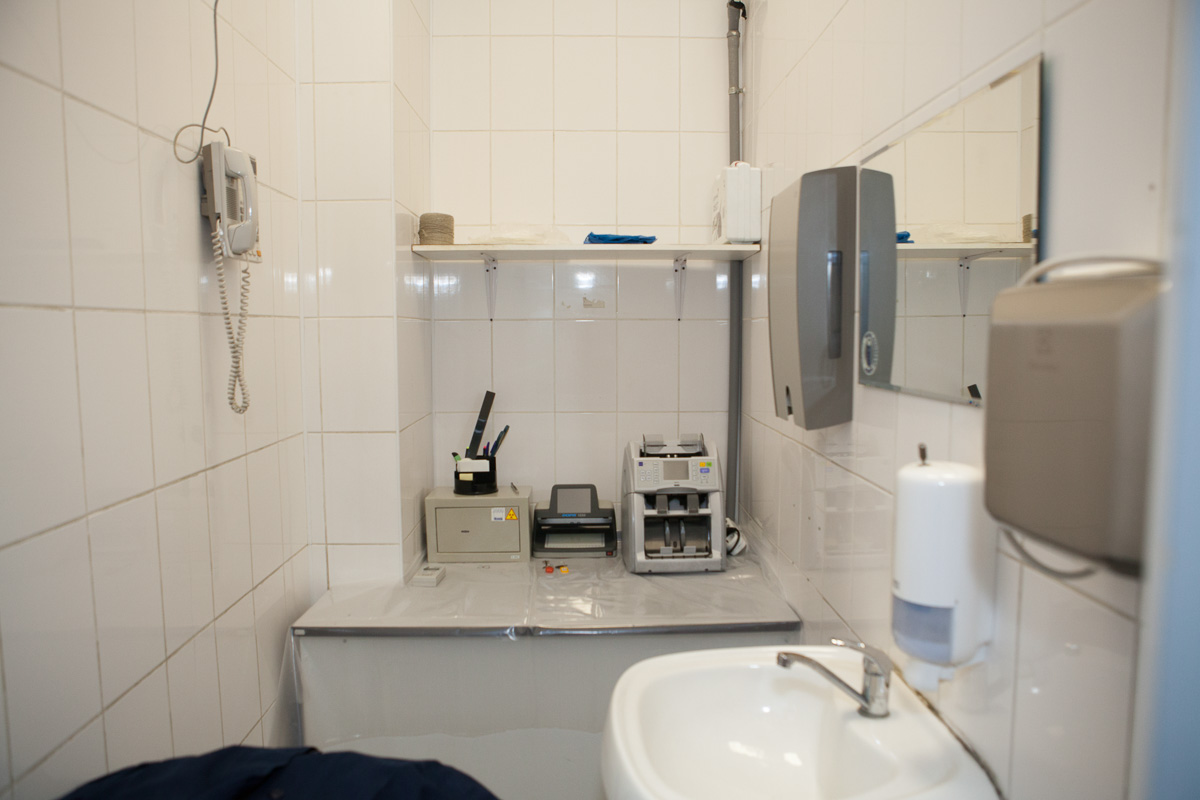 À l'aide de pinces spéciales d'un demi-mètre à un mètre de long, des paquets de réserves de liquidités sont chargés dans un chariot métallique et transportés dans une salle spéciale, qui devrait se trouver dans chaque agence bancaire qui manipule des espèces. Conformément au 131-I, il doit s'agir d'un local chauffé comprenant une table, de l'eau courante, une hotte aspirante, une trousse de secours, un extincteur, un radiomètre-dosimètre, un appareil d'authentification des billets, un coffre-fort et un téléphone. Ce dernier est nécessaire à la communication avec le monde extérieur - la pièce est verrouillée jusqu'à la fin des manipulations avec la protection de la télécommande.