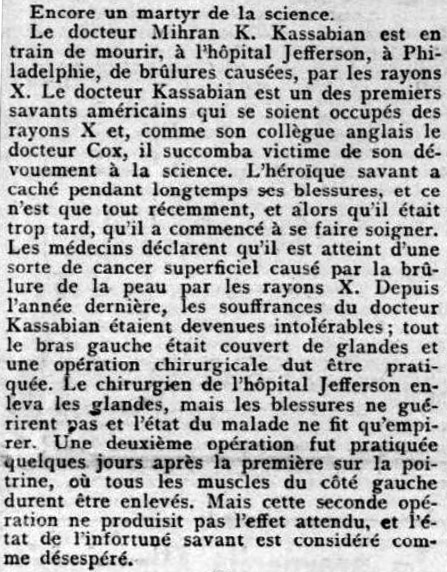 En 1911, un rapport fournit la liste de quatre-vingt-quatorze cas de tumeurs cancéreuses (chez l'homme) dues aux mêmes rayons, on compte parmi les victimes cinquante radiologues, c'est-à-dire les experts eux-mêmes. Plus tard, ces premiers manipulateurs des rayons X deviendront des « martyrs de la science », en vingt ans, il y en aura des centaines.
