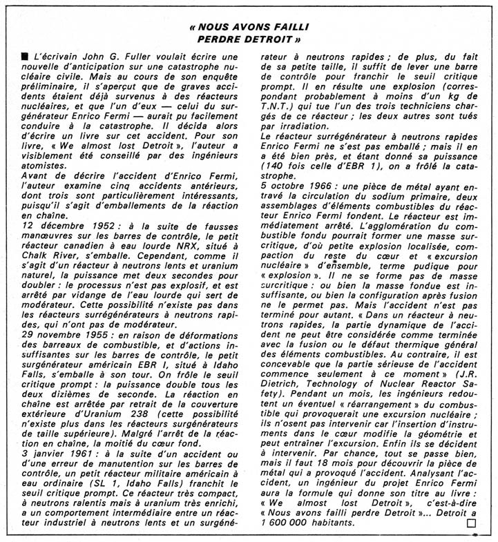 Le 5 octobre 1966, le plus ambitieux de tous les projets d'énergie nucléaire adoptés par les compagnies d'électricité américaines, le surgénérateurs commercial expérimental de la Detroit Edison, sur les rives du lac Erié, baptisé Fermi I, connaît de sérieux ennuis. Au fond du réacteur, une pièce de métal obstrue partiellement le circuit de fluide caloporteur du coeur ; en conséquence une petite partie du coeur surchauffé a fondu, libérant de dangereux gaz radioactifs à l'intérieur de la structure qui enveloppe le coeur ; pour autant que les ingénieurs puissent juger, il semble qu'une grave catastrophe soit imminente. En fait, sur le coup, l'équipe d'ingénieurs responsables du réacteur n'a aucune idée ni des causes ni des conséquences de l'accident. Il leur faudra six mois pour déterminer l'étendue totale du désastre et une année entière pour en découvrir les raisons. Dans les premiers temps, impuissants, ils se contentent donc d'espérer que le coeur endommagé va se stabiliser sans autre mésaventure, mais n'en continuent pas moins d'afficher une belle assurance. L'activité relâchée dans le sodium et le gaz de couverture a été estimée à environ 10 000 Curies. Remis en service en 1968, il a été définitivement arrêté depuis.