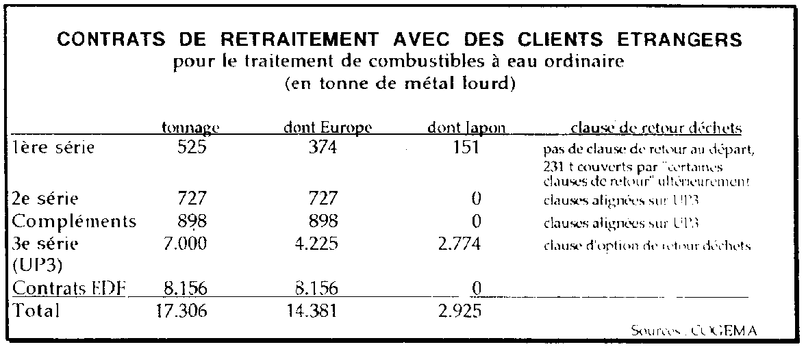 Les chiffres diffusés par COGEMA, concernant les combustibles sous contrat (voir tableau), sont contradictoires avec les chiffres avancés par certains clients étrangers. Ainsi, le gouvernement belge affirme avoir contracté 530 au lieu des 464 tonnes indiquées.(19) Selon un représentant de l'industrie belge interrogé par l'auteur, la quantité supplémentaire aurait été contractée " à très bon prix " en dehors du contrat de base.