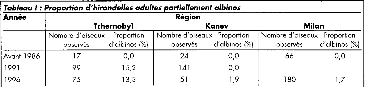 L'étude de Hans Ellegren, Gabriella Lindgren, Craig R. Primmer et Anders Pape Møller, parue dans le numéro du 9 octobre 1997 de la revue Nature, sous le titre Fitness loss and germline mutations in barn swallows breeding in Chernobyl, montre en effet qu'environ une hirondelle sur dix est partiellement albinos dans ces lieux enchantés. Plus précisément, sur un échantillon de 75 individus de l'espèce Hirundo rustica observés en 1996, 10 (13,3%) présentent cette particularité; alors que dans des régions non (ou peu?) contaminée (Kanev en Ukraine et Milan en Italie) la proportion est respectivement de 1,9% (pour 51 individus observés) et 1,5% (pour 130 individus observés) à la même époque. En 1991 les résultats étaient voisins. Les collections de musée permettent d'avoir une idée de la situation avant 1986 : pour les 3 sites, sur des échantillons plus restreints, la proportion d'individus albinos était nulle (Tableau I).