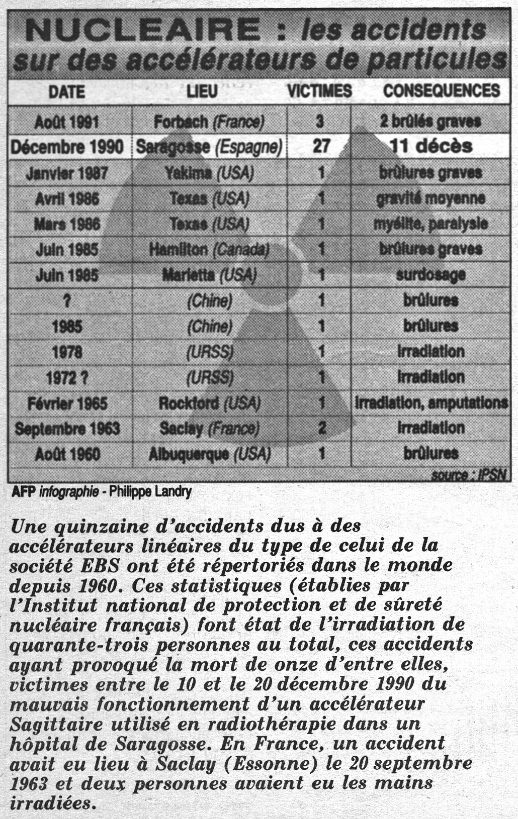 Le 17 juillet 1991, un bac d'aluminium contenant des plaques de matière caoutchouteuse (durcissement sous irradiation) s'était bloqué sous le "scanner" dans lequel le faisceau d'électrons effectue son va-et-vient. L'énergie délivrée a enflammé la matière et la "fenêtre" en titane du scanner a été endommagée. Il a fallu l'importer des Etats-Unis ce qui a occasionné un retard de production.