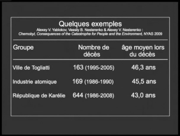 Le tour de passe-passe " scientifique " consiste à utiliser l'expérience de Hiroshima pour expliquer Tchernobyl. Il est erroné de comparer ces deux désastres. Il n'y a pas eu d'explosion atomique à Tchernobyl. Tchernobyl a connu une explosion thermique et un incendie qui a duré 10 jours. Des tonnes d'éléments radioactifs ont été déversées sur les territoires au gré des vents et des pluies, dont certains ne disparaîtront qu'au bout de plusieurs siècles. Ils ont détruit la santé et la vie de centaines de milliers de jeunes hommes en pleine santé et contamineront les générations futures.