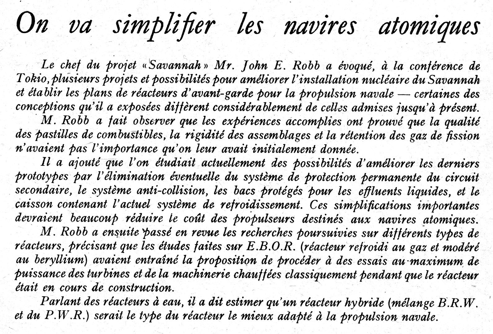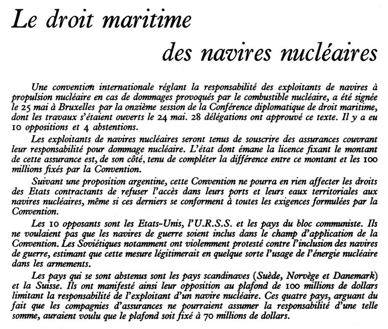Enfin, le « Mutsu », navire expérimental à propulsion nucléaire japonais, mis à l'eau en août 1974, il se mit un mois plus tard, à perdre de la radioactivité en mer. Le colmatage de la brèche par où s'échappait la radioactivité, à l'aide de chaussettes et de boulettes de riz, est resté dans les annales tragi-comiques de l'aventure nucléaire japonaise. L'administration japonaise ne s'avouant jamais vaincue. Elle reprit ses travaux sur le Mutsu après seize ans de piteux silence. Et le navire atomique reprit la mer en juillet 90. Avant de regagner définitivement son ponton en janvier 1992. La courte existence du Mutsu aura coûté aux contribuables japonais la coquette somme de 5 milliards de francs.