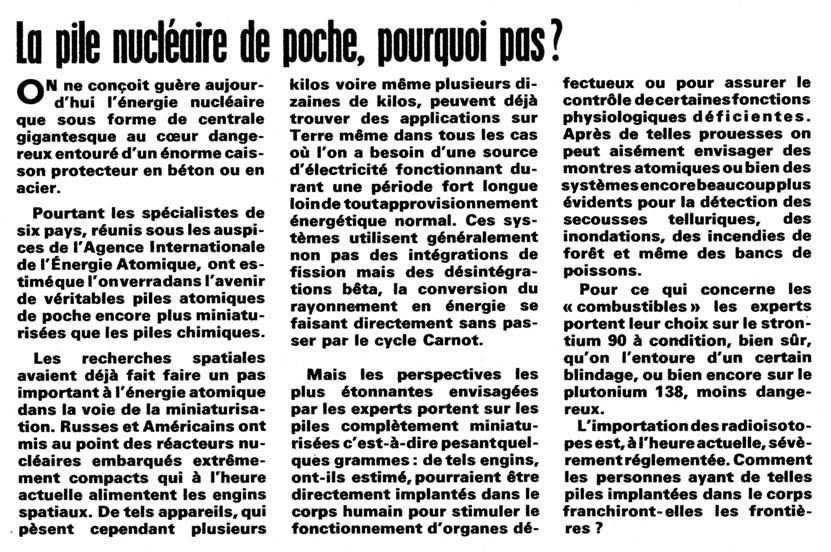 [...] Notre Commissariat à l'énergie atomique (CEA) eut à un moment un éclair de génie: doter le stimulateur cardiaque d'un générateur au plutonium 238. Un puissant émetteur de particules alpha, d'un très faible volume, devait garantir une durée de vie impressionnante à l'appareil. Les concepteurs du système ont d'ailleurs remarquablement résolu les problèmes de refroidissement, de confinement de la source, de transformation de l'énergie thermique en électricité. Et dans le minuscule espace alloué par un pacemaker. Ils ont simplement voulu méconnaitre les risques fantastiques que constituent ces charges ambulantes de plutonium, matière toxique dont l'absorption par l'être humain est très dangereuse. Des terroristes pouvaient facilement convoiter cette réserve de "poison" implanté chez un homme pour la déverser dans un réservoir d'eau potable et tuer ainsi des dizaines de milliers de personnes par contamination orale. Au demeurant, la réglementation internationale concernant le transport des matières fissiles faisait des parias de ces "empilés" au plutonium. Il y eut cependant plus de mille patients équipés du Gipsie (1) atomique, à un coût incomparablement supérieur à celui d'un appareil ordinaire.