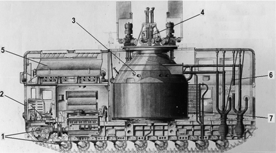 2. Body; 3. Reactor with shielding; 4. CPS actuators; 5. Radiator;