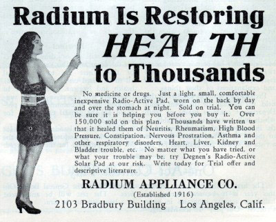 1929 Radium Solar Pad original vintage advertisement. This device consisted of a radioactive pad worn on the back. Touted to relieve numerous ailments such as indigestion, asthma, neuritis, paralysis, rheumatism and more. Includes quotes from 5 medical experts including Madame Marie Curie: