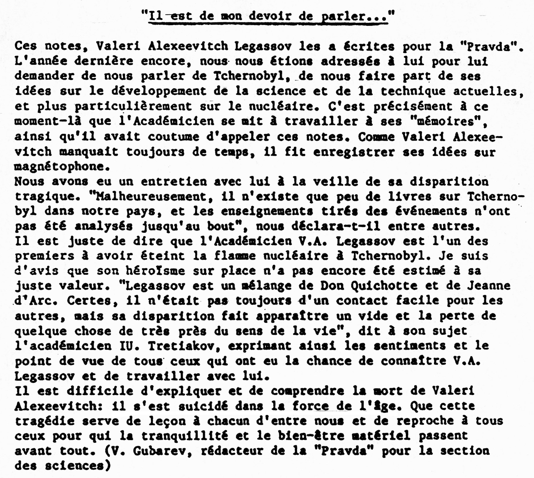 Ce témoignage du physicien Valeri Alexeevitch Legassov, membre de l'Académie des sciences d'URSS, est paru le 20 mai 1988 dans La Pravda. Legassov, nucléariste convaincu, a été membre de la première Commission gouvernementale chargée de la gestion du désastre de Tchernobyl.