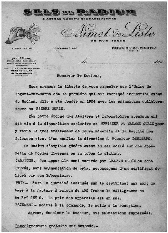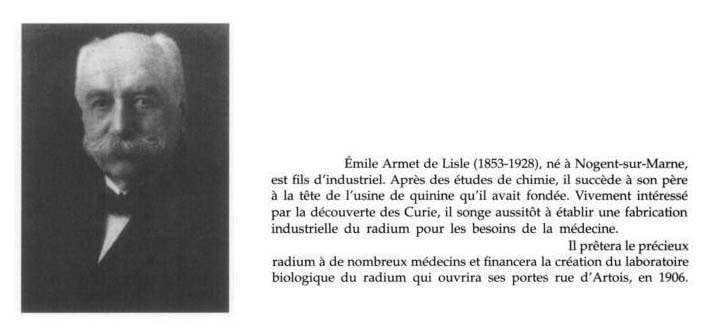 A la mort de son père, Emile Armet de Lisle hérite en 1878 d'une fabrique de quinquinas. Installée à Nogent-sur-Marne, cette usine est perçue comme la plus importante dans sa spécialité, chaque année, elle traite 500 000 kilos de quinquinna. Quand il prend la direction de la maison, Emile Armet de Lisle se contente d'abord de poursuivre l'entreprise de son père. Mais très vite, il s'intéresse aux travaux des Curie. Dès le départ, des relations serrées se nouent entre lui et le laboratoire des Curie. En 1904, il se lance grâce à eux dans la production industrielle du radium (voir article à droite dans La France, le 28 décembre 1905). Pour Armet de Lisle, le laboratoire est un réservoir naturel de techniciens et conseillers. De surcroît, son entreprise peut associer son nom à celui du couple de savants les plus célèbres de France. Sa publicité ne se fait pas faute de le rappeler: l'activité de ses sels de radium « est mesurée avec les appareils de M. Curie par son préparateur Mr Danne ». En retour, les Curie obtiennent un soutien logistique essentiel pour leurs travaux.