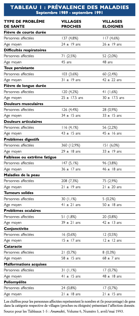 La différence la plus immédiatement remarquable était le contraste frappant dans la répartition des maladies et affections dans les deux zones. Plus de gens se plaignaient de maladies et d'un plus grand nombre de maladies dans la zone proche de la centrale de Rawatbhata. Alors que 25 pour cent des gens de la zone éloignée mentionnaient une maladie quelconque, le taux passait à 45 pour cent dans la zone proche. Dans 68 foyers sur 551, au moins un membre mentionnait quatre problèmes différents de santé, alors que le nombre de ces foyers dans la zone éloignée n'était que de 9 sur 472. Le tableau 1 donne une comparaison de la prévalence des maladies entre les villages proches et les villages éloignés.