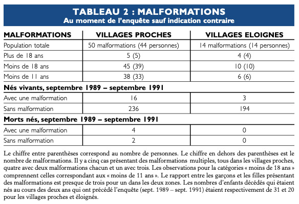 Les différences de santé les plus fâcheuses étaient celles relatives aux conséquences de la grossesse. Elles étaient observables à tous les niveaux, notamment dans le nombre significativement plus élevé de fausses couches, de mort-nés, de décès chez les nouveau-nés et les malformations congénitales parmi ceux qui étaient en vie et ceux qui étaient morts au cours des deux dernières années. Par exemple, le nombre total de malformations congénitales s'élevait à 50 chez 45 enfants vivant près de la centrale, et 14 malformations chez 14 enfants qui vivaient dans les villages éloignés.5 Ces chiffres sont significatifs d'un point de vue statistique, mais leur signification devient encore plus nette quand on observe les différences parmi ceux qui sont nés après le démarrage de la centrale nucléaire. Alors que le nombre de malformations parmi ceux qui avaient plus de 18 ans était de 5 à proximité de la centrale contre 4 à distance de celle-ci, les chiffres étaient de 38 contre 6 parmi ceux qui avaient moins de 11 ans quand les deux unités de la centrale ont commencé à fonctionner (1981).