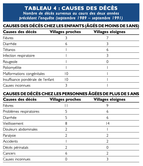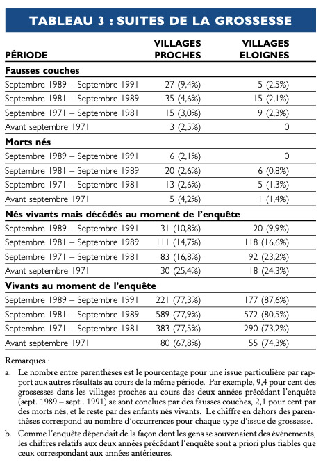 De la même manière, divers indices relatifs à la maternité - comme le nombre moyen de grossesses, la taille moyenne de la famille, l'âge des femmes au moment du mariage, l'âge de la mère à la naissance du premier enfant, l'âge de la mère au moment d'une fausse couche, et l'âge de la mère à la naissance d'enfants morts nés ou victimes d'une malformation - étaient très similaires dans les deux zones. Les conditions de vie dans les deux zones étaient également très semblables, comme en témoignent la taille et le type des maisons, le temps nécessaire à chercher de l'eau potable, le combustible pour la cuisson des aliments et d'autres facteurs.