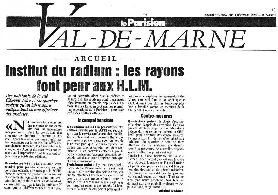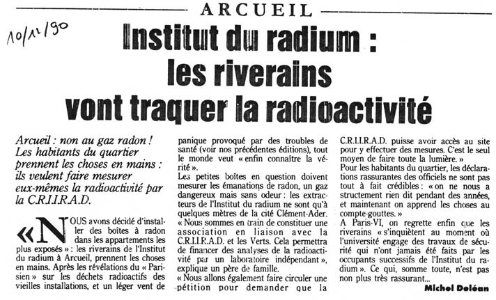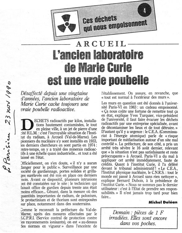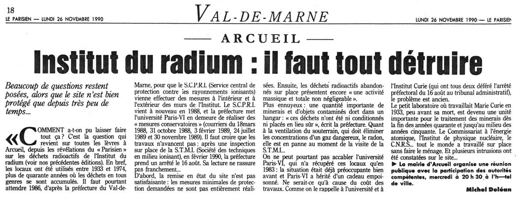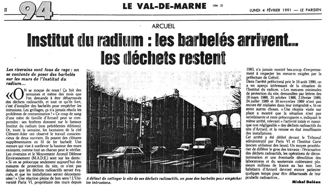 C'est dans les années 1930 que Marie Curie installe ses laboratoires en plein centre-ville d'Arcueil. Dans ce laboratoire, elle va extraire des radioéléments naturels à partir de minerais d'origines diverses qui sont régulièrement importés par camions. Par la suite, l'Institut de physique nucléaire de la faculté des sciences de Paris et Orsay y effectue des recherches avant que la Fondation Curie-Institut du radium ne prenne sa place pour ses propres études radiochimiques. En 1978, les locaux sont abandonnés et mis sous surveillance. Dans les années 1980, le préfet du Val-de-Marne demande au propriétaire, qui est l'université Paris-VI, d'assurer la sécurité des lieux par une clôture interdisant toute intrusion et par un murage du bâtiment le plus contaminé. En 1991, puis en 2000, les 5400 m2 de terrain et les 500 m2 de bâtiments font l'objet d'une décontamination. Deux tonnes de produits chimiques sont enlevées mais des flacons et des fioles de produits chimiques et radioactifs continuent à dormir dans un souterrain inaccessible. Mais la décontamination coûte cher et, ni le ministère de l'Education nationale, ni celui de l'Environnement ne débloquent les crédits nécessaires à l'opération. L'année dernière, une réunion publique avait permis aux riverains d'apprendre que la dépollution se poursuivait et devrait être achevée en 2012.