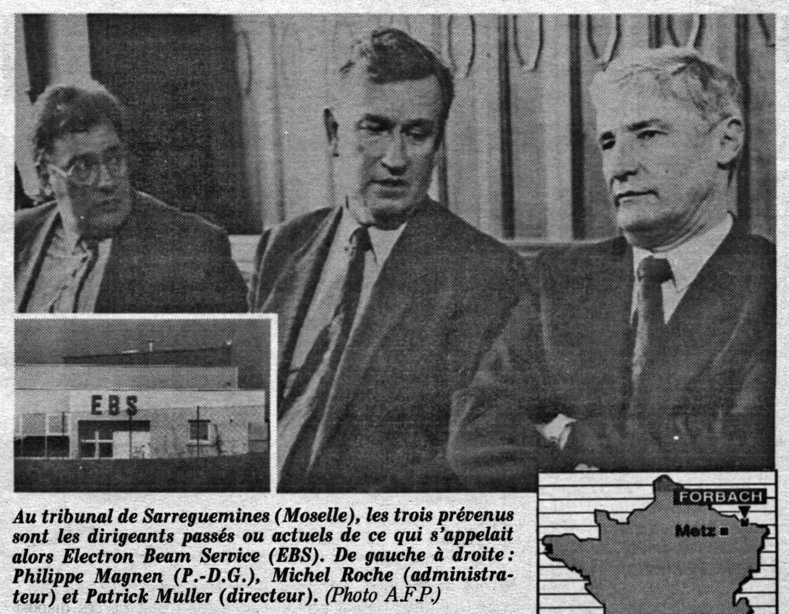 Après diverses difficultés (2), le bâtiment et l'accélérateur sont rachetés aux organismes financiers qui en avaient la propriété, par M. Magnen Philippe (PDG de Rical S.A. qui a son siège à Longvic) qui crée une nouvelle société, dénommée "Electron Beam Service" - EBS -, dont les statuts seront déposés le 19 juillet 1991 (D 194). M. Magnen en est le PDG.