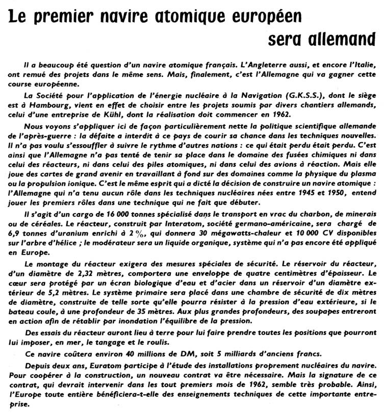 Enfin, le « Mutsu », navire expérimental à propulsion nucléaire japonais, mis à l'eau en août 1974, il se mit un mois plus tard, à perdre de la radioactivité en mer. Le colmatage de la brèche par où s'échappait la radioactivité, à l'aide de chaussettes et de boulettes de riz, est resté dans les annales tragi-comiques de l'aventure nucléaire japonaise. L'administration japonaise ne s'avouant jamais vaincue. Elle reprit ses travaux sur le Mutsu après seize ans de piteux silence. Et le navire atomique reprit la mer en juillet 90. Avant de regagner définitivement son ponton en janvier 1992. La courte existence du Mutsu aura coûté aux contribuables japonais la coquette somme de 5 milliards de francs.