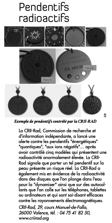 Outre les pendentifs, le laboratoire de la CRIIRAD a confirmé que des matières radioactives ont été utilisées pour la fabrication d'autocollants dits antiradiation (à apposer sur les téléphones portables et tout appareil électrique) et dans des disques en caoutchouc dits « à énergie quantique » (utilisable en sous-verre pour le « traitement » de l'eau ou en application sur la peau pour le « traitement » des douleurs).