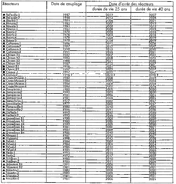 Nous donnons pour chacun des 57 réacteurs en fonctionnement la date de couplage au réseau, la date de mise à l'arrêt pour une durée de vie du réacteur de 25 ans et pour une durée de vie de 40 ans comme le prévoit EDF. Le couplage du 58e réacteur (Civaux-2) est prévu pour 1998-1999.